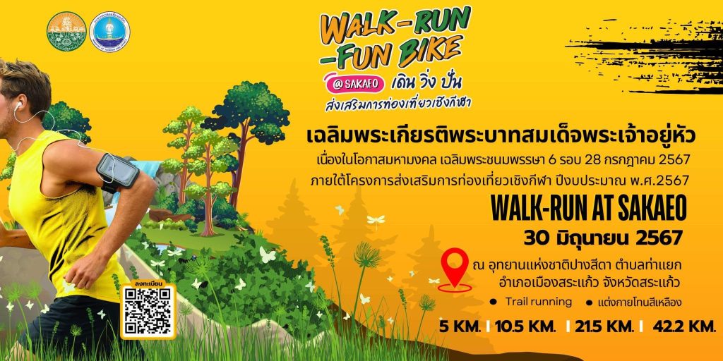 – กิจกรรมส่งเสริมการท่องเที่ยวตามเส้นทางเดิน-วิ่ง จังหวัดสระแก้ว (walk-run@สระแก้ว) กำหนดจัดในวันที่ 30 มิถุนายน 2567 ประกอบด้วย 4 ระยะ คือ Fun run (5 กม.), มินิมาราธอน (10.5 กม.), ฮาล์ฟมาราธอน (21.1 กม.) และ มาราธอน (42.2 กม.) เส้นทางมีลักษณะเป็นกึ่งเทรลและเทรล