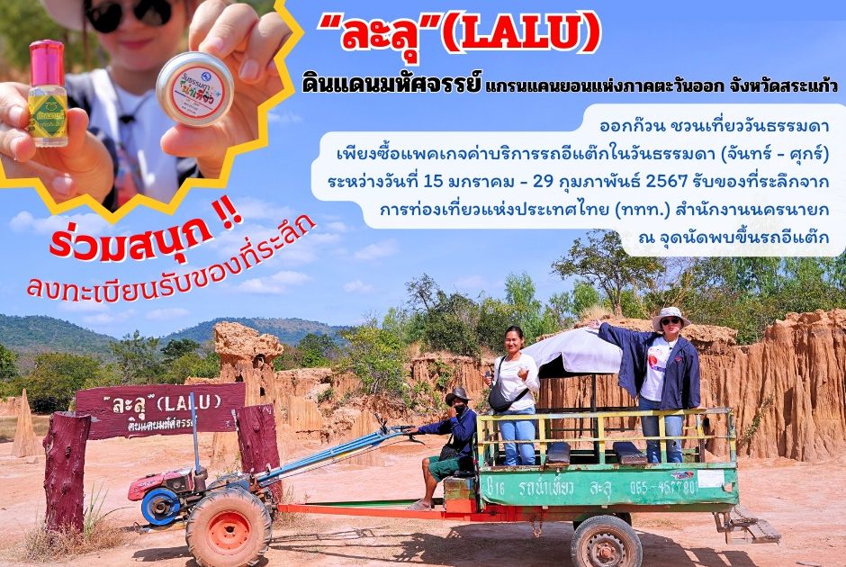 “ละลุ LALU” ดินแดนมหัศจรรย์ แกรนแคนยอนแห่งภาคตะวันออก จังหวัดสระแก้ว ออกก๊วน ชวนเที่ยววันธรรมดา เพียงซื้อแพคเกจค่าบริการรถอีแต๊ก ในวันธรรมดา (จันทร์-ศุกร์) เท่านั้น ลงทะเบียนรับสินค้าที่ระลึกจาก การท่องเที่ยวแห่งประเทศไทย (ททท.) สำนักงานนครนายก รับของที่ระลึกวันธรรมดาน่าเที่ยว ที่จุดขึ้นรถอีแต๊ก ศูนย์บริการนักท่องเที่ยวละลุ อ.ตาพระยา จ.สระแก้ว